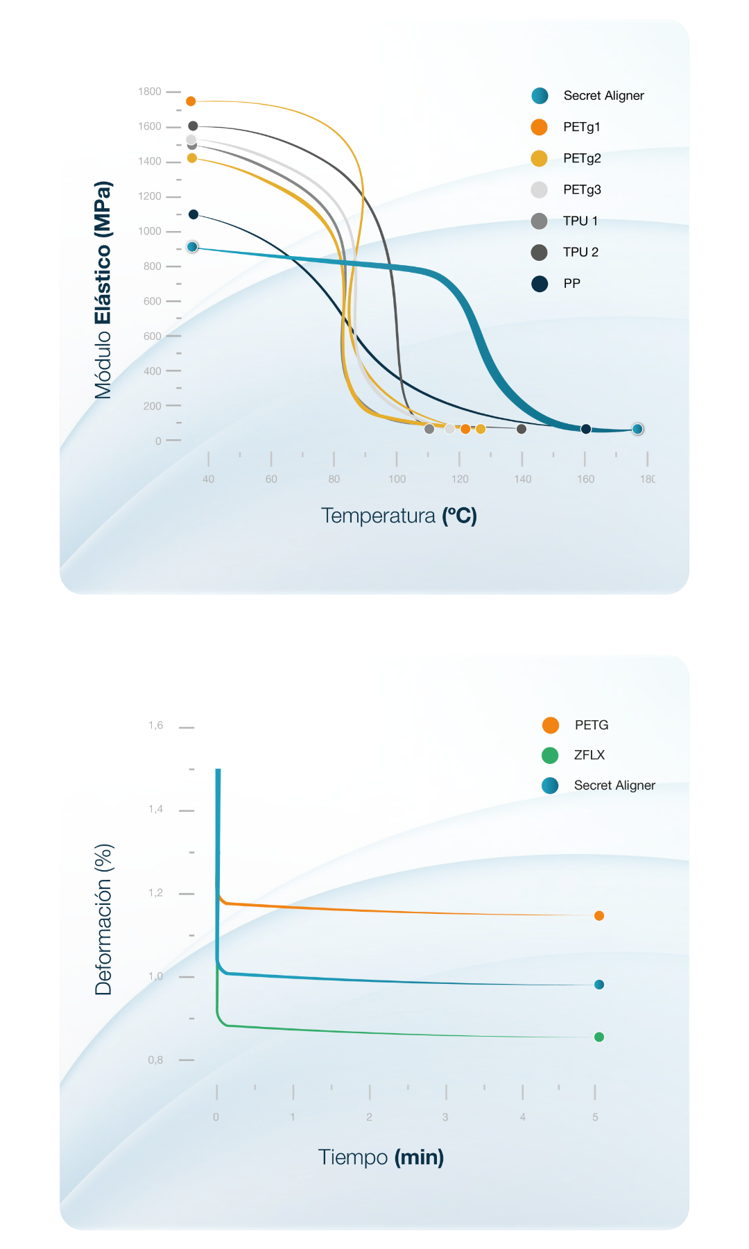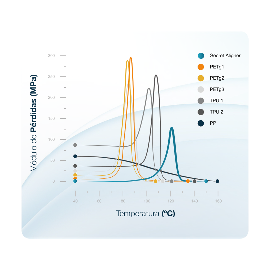 Esto quiere decir, que nuestros alineadores son capaces de generar la fuerza necesaria para realizar los movimientos planificados en un entorno cálido como es la boca, durante más tiempo, al tener una temperatura de transición vítrea de prácticamente el triple que la de la boca humana.